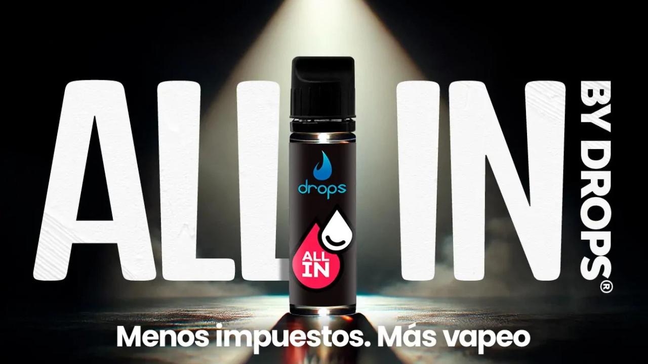 All In de Drops es un formato innovador de e-líquido para vapeo que consiste en una botella de 60 ml con 10 ml de aroma y la concentración de nicotina seleccionada (3 mg, 10 mg o 20 mg).